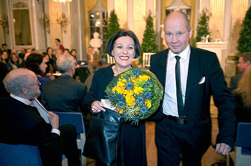 2.赫塔·米勒2009.12.10在斯德哥尔摩音乐大厅接受瑞典国王卡尔十六世·古斯塔夫颁发的2009年诺贝尔文学奖。