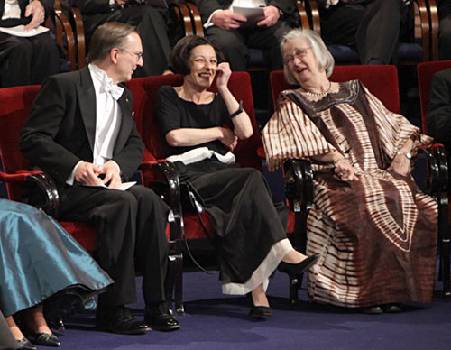 17.赫塔·米勒2009.12.10在斯德哥尔摩音乐大厅诺贝尔颁奖典礼与经济学奖得主埃莉诺·奥斯特罗姆生理学或医学奖得主杰克·绍斯塔交谈。