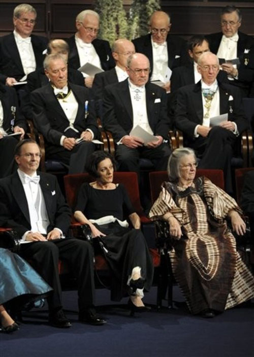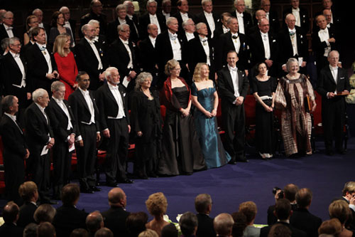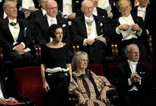 19.赫塔·米勒2009.12.10在斯德哥尔摩音乐大厅诺贝尔颁奖典礼与诺贝尔奖得主们之彩照。