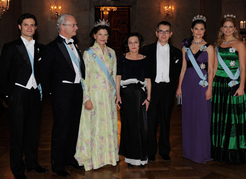 22.赫塔·米勒2009.12.10在斯德哥尔摩市政大厅诺贝尔宴会上与瑞典国王、王后、王子、公主等王室成员合影。