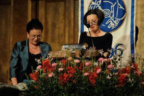 23.赫塔·米勒2009.12.10在斯德哥尔摩市政大厅诺贝尔宴会上演讲,身旁为英语女翻译鲁斯·贾科比。