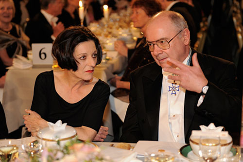 24.赫塔·米勒2009.12.10在斯德哥尔摩市政大厅诺贝尔宴会上与1988年诺贝尔化学奖得主约翰· 戴森霍弗交谈。