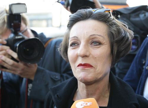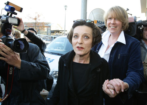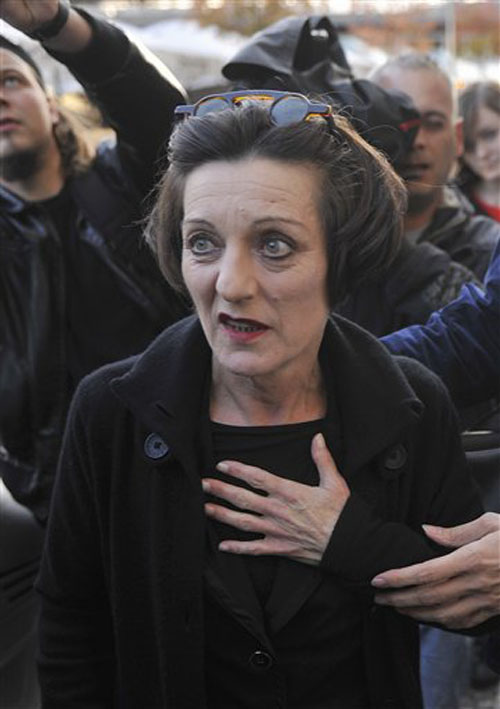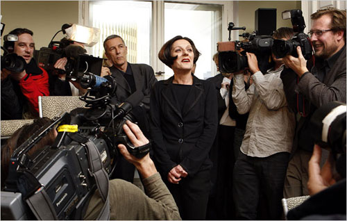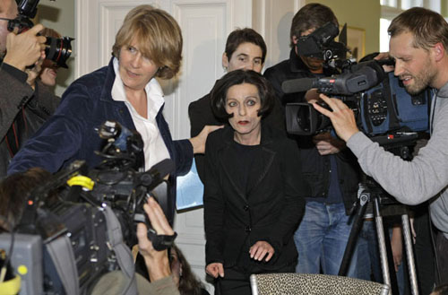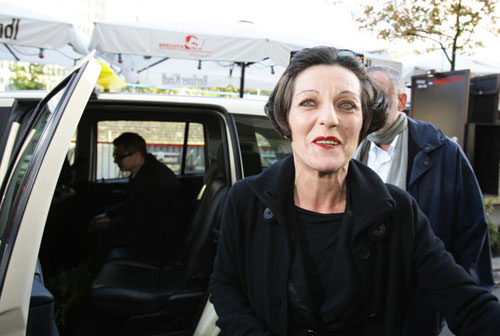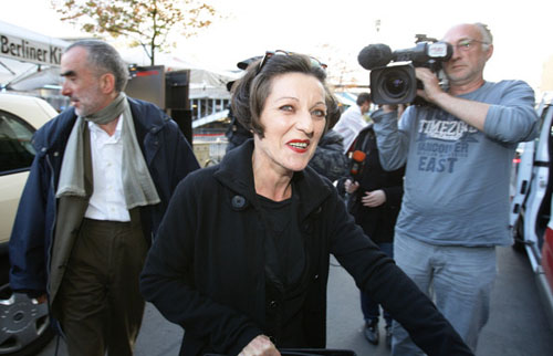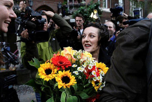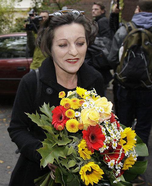 31.赫塔·米勒2009.10.8走出位于柏林的住所接受祝贺。