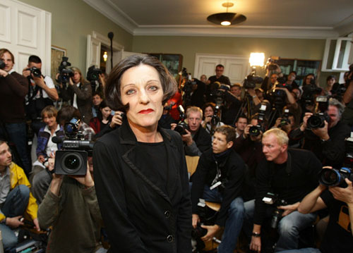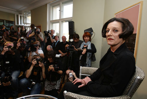 88.赫塔·米勒2009.10.8在柏林获悉获得2009年诺贝尔文学奖后召开新闻发布会上彩照。