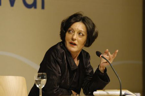 72.赫塔·米勒2009.10.8出席在柏林召开的新闻发布会侧坐演讲彩照。