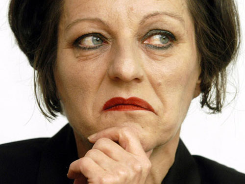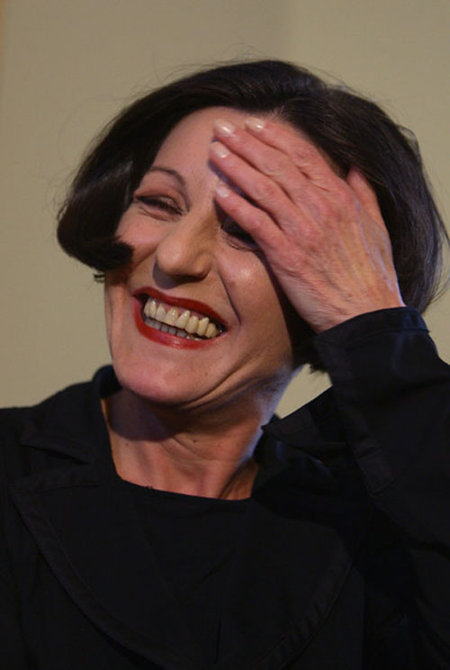 65.赫塔·米勒2009.10.8出席在柏林召开的新闻发布会侧坐抚额开怀大笑彩照。