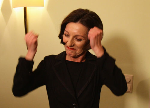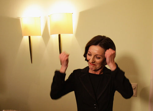 74.赫塔·米勒2009.10.8出席在柏林召开的新闻发布会高举双臂彩色照。