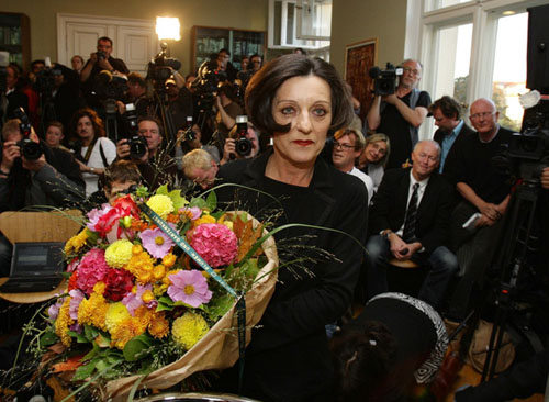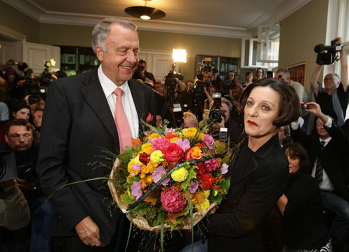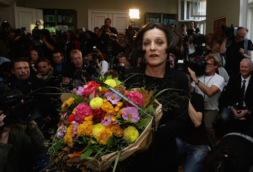 77.赫塔·米勒2009.10.8出席在柏林召开的新闻发布会接受献花。