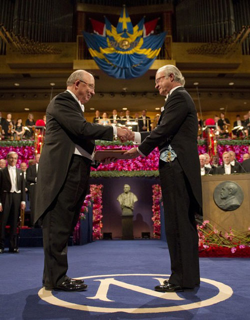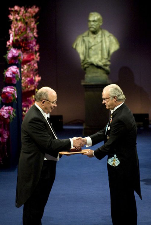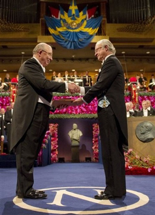 3.戴尔·托马斯·莫特森2010.12.10在斯德哥尔摩音乐大厅接受瑞典国王卡尔十六世·古斯塔夫颁发2010年诺贝尔经济学奖彩色照