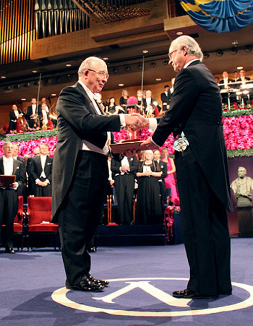 4.戴尔·托马斯·莫特森2010.12.10在斯德哥尔摩音乐大厅接受瑞典国王卡尔十六世·古斯塔夫颁发2010年诺贝尔经济学奖之彩色照