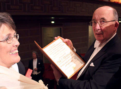 24.戴尔·托马斯·莫特森2010.12.10与夫人贝弗利 Beverly P. Mortensen在斯德哥尔摩音乐大厅诺贝尔颁奖典礼上 展示证书