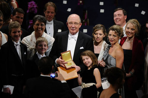 25.戴尔·托马斯·莫特森2010.12.10与家人在斯德哥尔摩音乐大厅诺贝尔颁奖仪式上展示所获奖章与证书