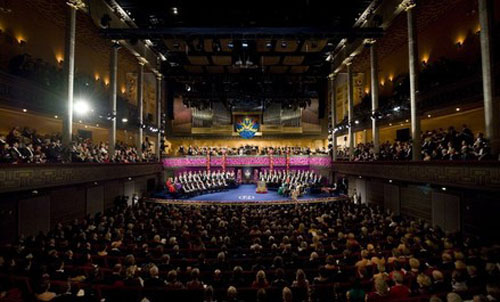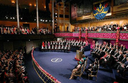 26.戴尔·托马斯·莫特森2010.12.10与众得主在斯德哥尔摩音乐大厅诺贝尔颁奖现场彩色照片