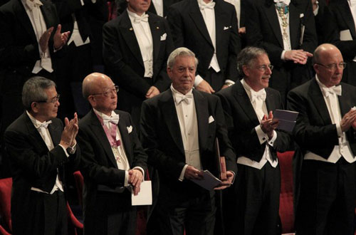 20.戴尔·托马斯·莫特森2010.12.10与彼得·阿瑟·戴蒙德、克里斯托弗·安东尼奥·皮萨里德斯及文学奖得主马里奥·巴尔加斯·略萨在斯德哥尔摩音乐大厅诺贝尔颁奖现场彩照